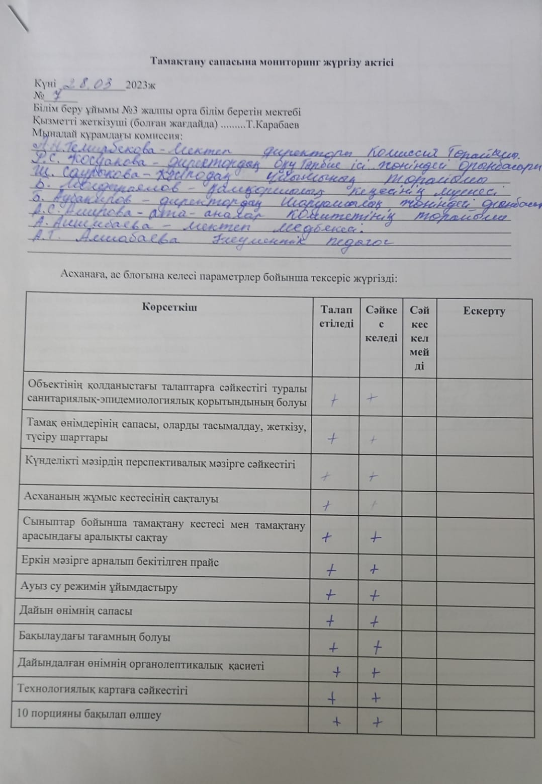28 наурыз күні тамақтану сапасына мониторинг жүргізу мақсатында бракераж комиссиясы мектеп асханасына тексеру жүргізді. Тексеру қорытындысы актпен рәсімделіп, комиссия отырысында талқыланды. Тексеру нәтижелері сарапталып, түзету бойынша ұсыныс берілді. Анықталған кемшіліктерді жою үшін 5 жұмыс күні ұсынылды.